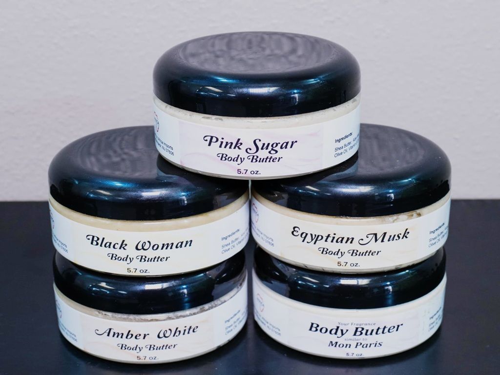 Rich and creamy body butters available in Pink Sugar, Black Woman, Amber White, Egyptian Musk, and Mon Paris scents.