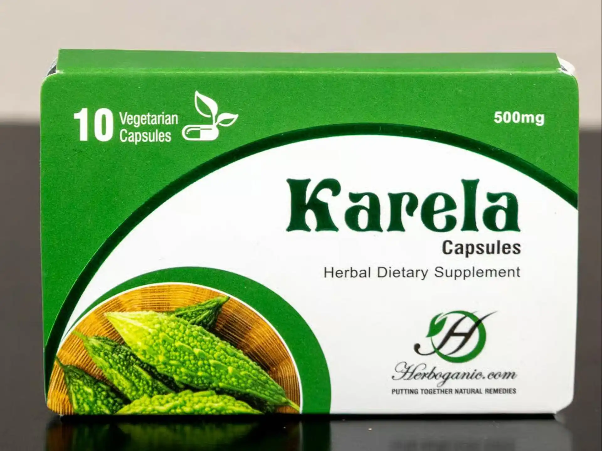 Herbal dietary supplement capsules containing 500mg of organic bitter melon extract.
